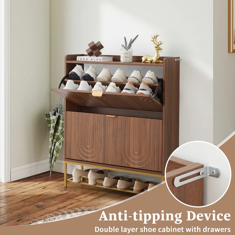 تجسّد خزانة الأحذية أرفيــو التوازن المثالي بين الفخامة والعملية، بتصميم يجمع بين الخشب الطبيعي وخطوط هندسية منقوشة تضيف عمقًا وجاذبية على الواجهة. تعتمد الخزانة على نظام الفتح المائل الذي يسهل الوصول للأحذية وتنظيمها دون إهدار للمساحة، مع رف سفلي مفتوح يتيح تخزين الأحذية اليومية. القاعدة المعدنية باللون الذهبي تمنح القطعة روحًا عصرية، وتضمن في الوقت نفسه ثباتًا ممتازًا وتحمّلًا للاستخدام المستمر.