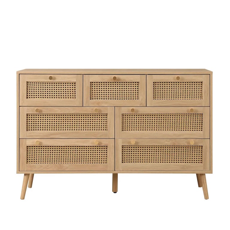 وحدة تلفزيون أنيقة تجمع بين الخطوط الهادئة والوظيفة العملية، مصنوعة من الخشب الطبيعي بواجهات مضلّعة متحركة وقاعدة بأرجل كروية تضيف لمسة تصميم مميزة لغرفة المعيشة.
