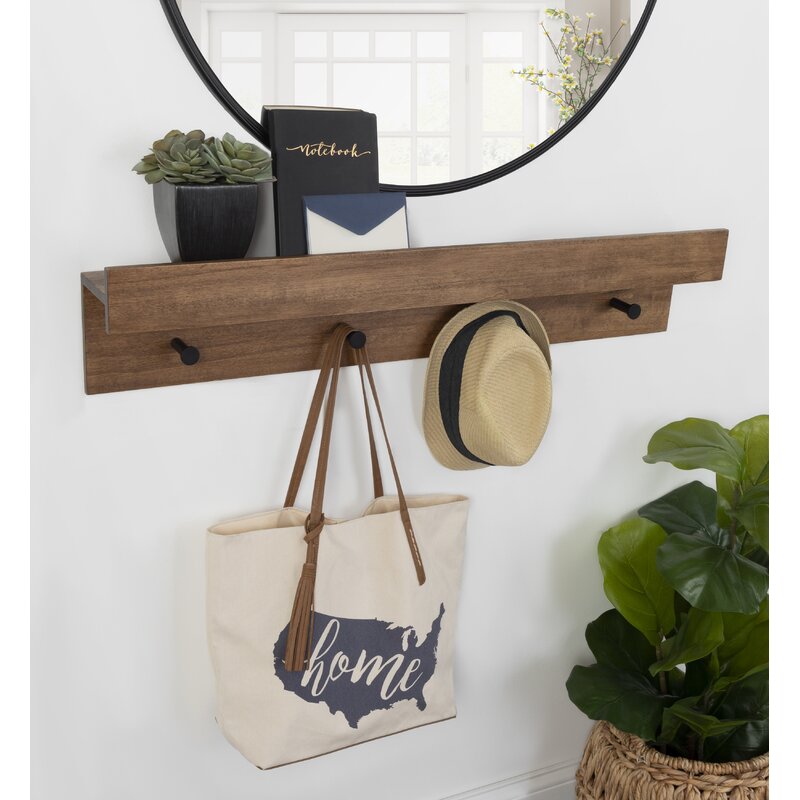 1. التصميم العصري للرف بلون الخشب الطبيعي مع الخطافات السوداء يضيف لمسة من الرقي والبساطة لديكور الحائط.