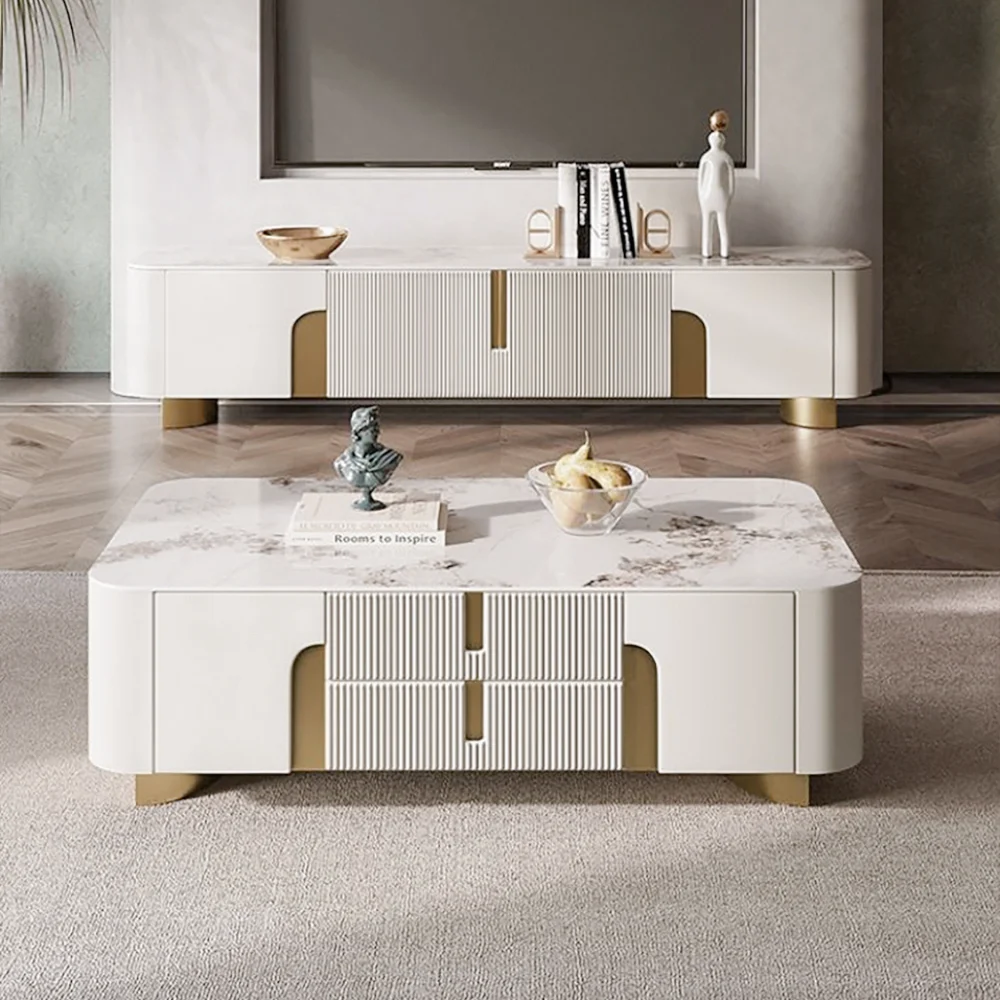 نوكتورن — طقم وحدة تلفزيون وطاولة قهوة من الخشب الطبيعي والاستانلس الذهبي