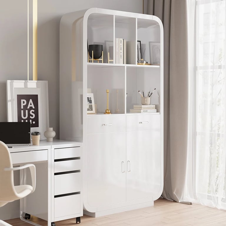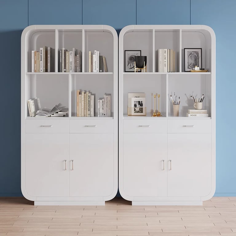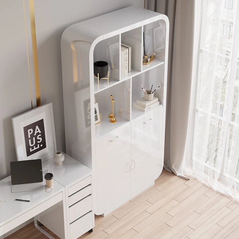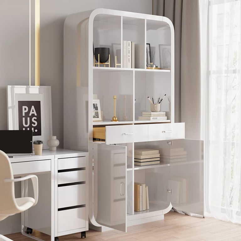 2. مكتبة عصرية مزودة برفوف، أبواب وأدراج لتخزين متعدد الاستخدامات.