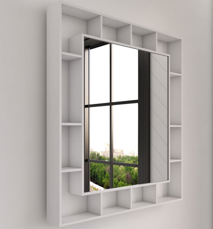 مرآة حمام عصرية مزودة بعدة أرفف تخزين، مصنوعة من الخشب الطبيعي المقاوم للرطوبة، لتجمع بين العملية، والأناقة، والوصول السهل إلى جميع المستلزمات.