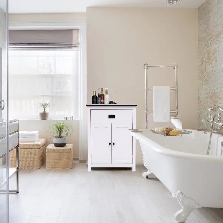 خزانة الحمام من القطع الأساسيه في منزلك حيث انها تجعل حمامك منظم ومرتب دائماً كما انها تعطي لحمامك مظهر فخم،حيث تتميز خزانة الحمام بتصميم راقي ومظهر كلاسيكي فهي مصنوعه من الخشب الهندسي ذات اللون الأبيض الجديد والجذاب ،فهي ذات تصميم ذكي ومساحات تخزين متعدده