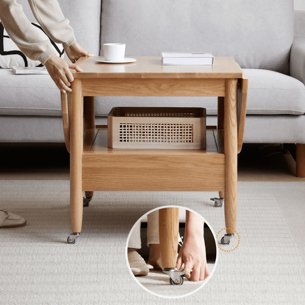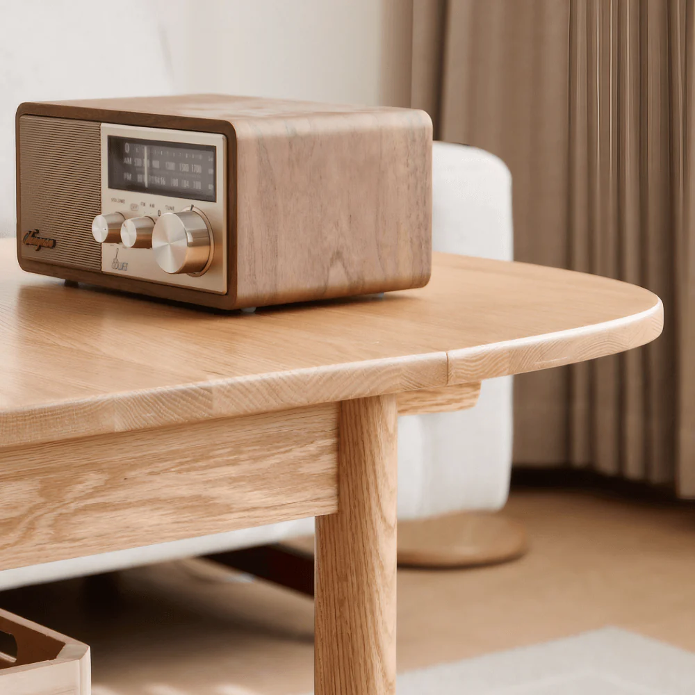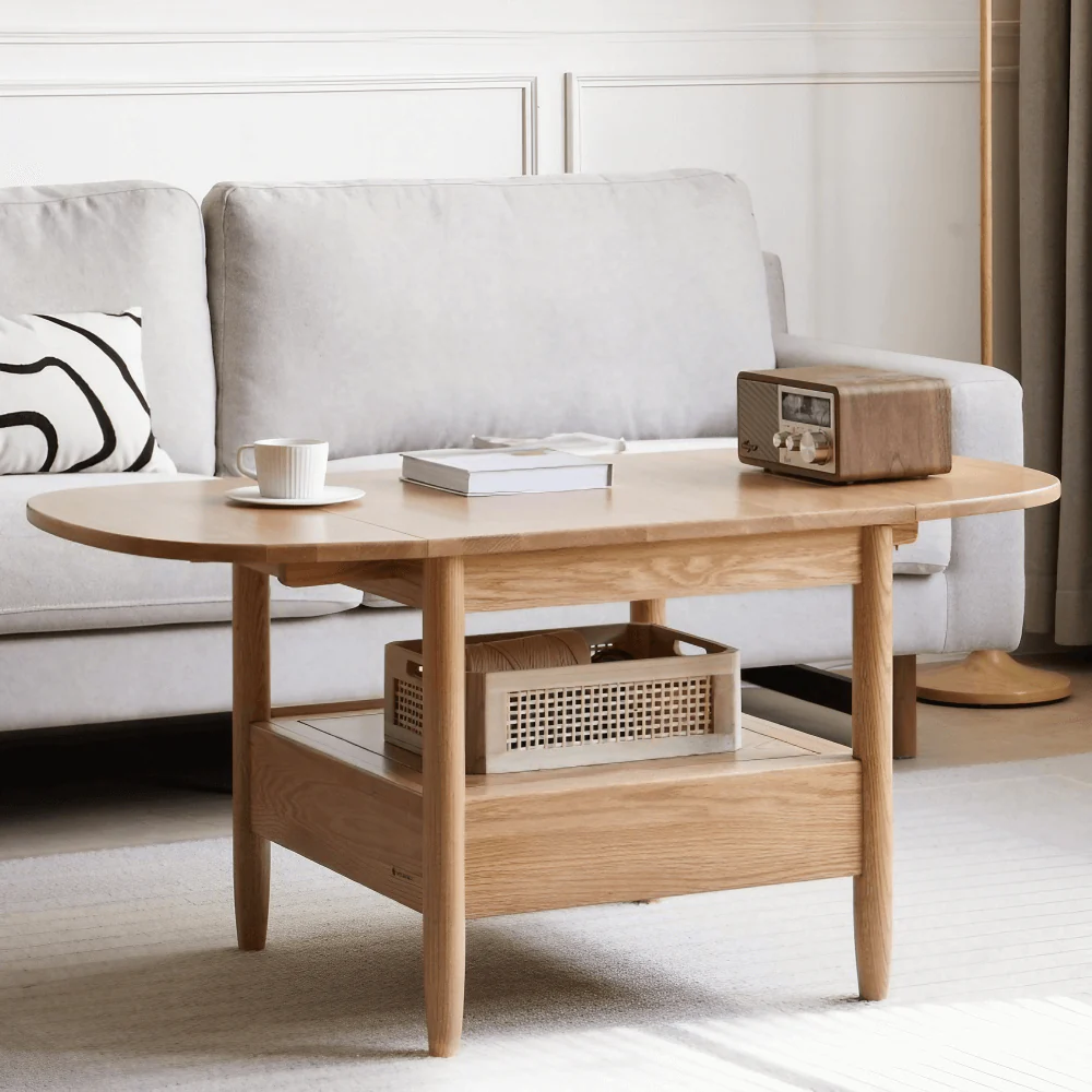 طاولة قهوة دائرية بتصميم أنيق مصنوع من الخشب الطبيعي، تجمع بين الشكل العصري ومساحات التخزين العملية، مع أبواب منزلقة تضيف سهولة استخدام ولمسة منظمة لغرفة المعيشة.