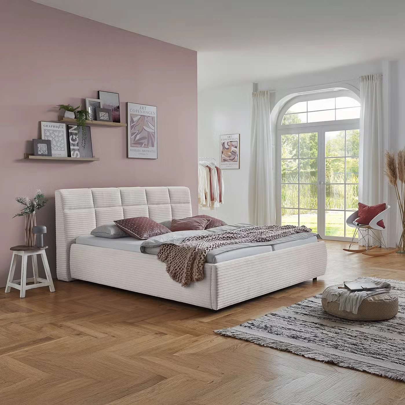 سرير مبطن بلوح رأسي يتميز بأناقة خالدة وقاعدة مصنوعة من الخشب الطبيعي 100%، ومعالج لمقاومة الماء والتشققات والحشرات. مصمم لراحة تدوم طويلاً.