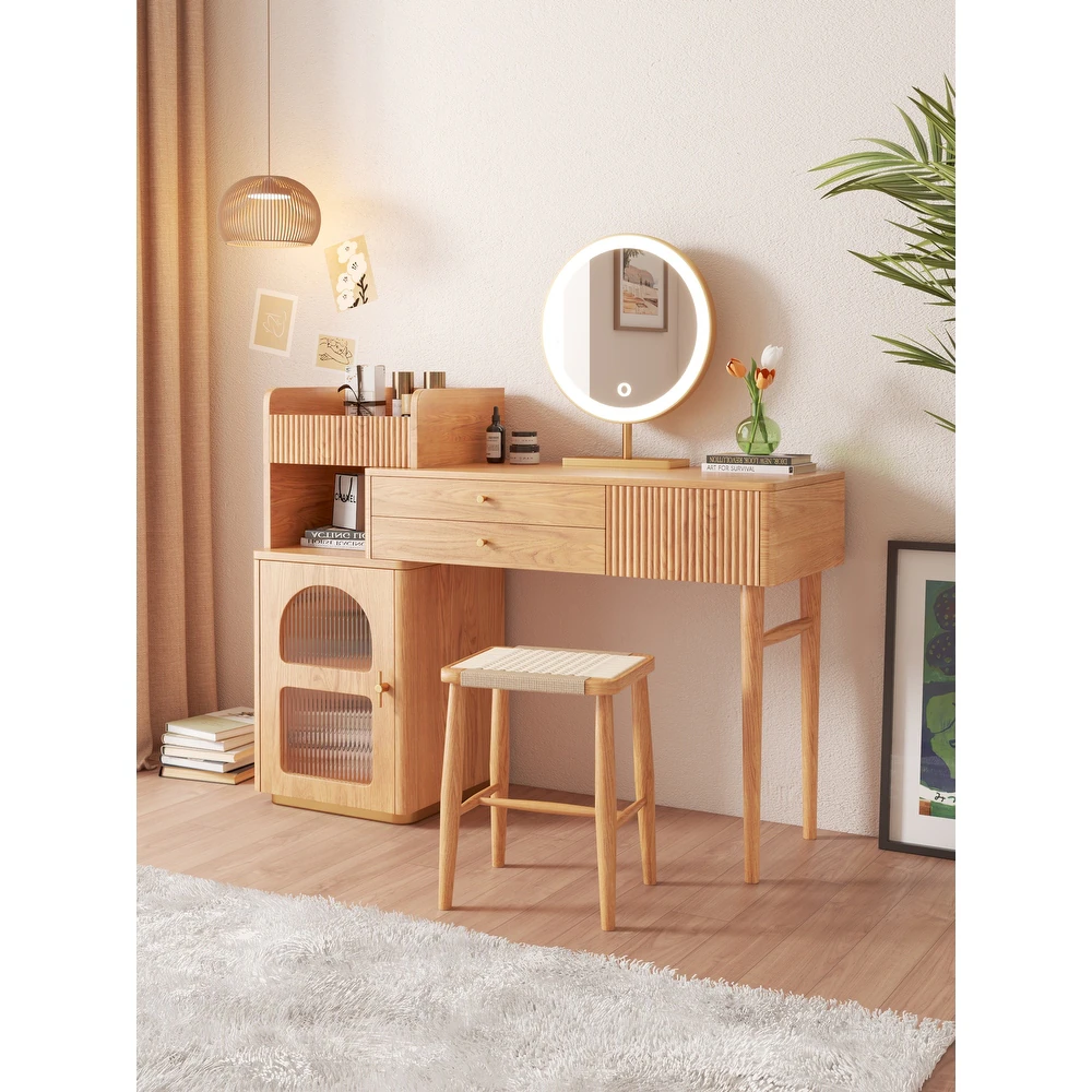 ليوني – طقم تسريحة خشب طبيعي مع مرآة مضيئة وكرسي وأدراج تخزين