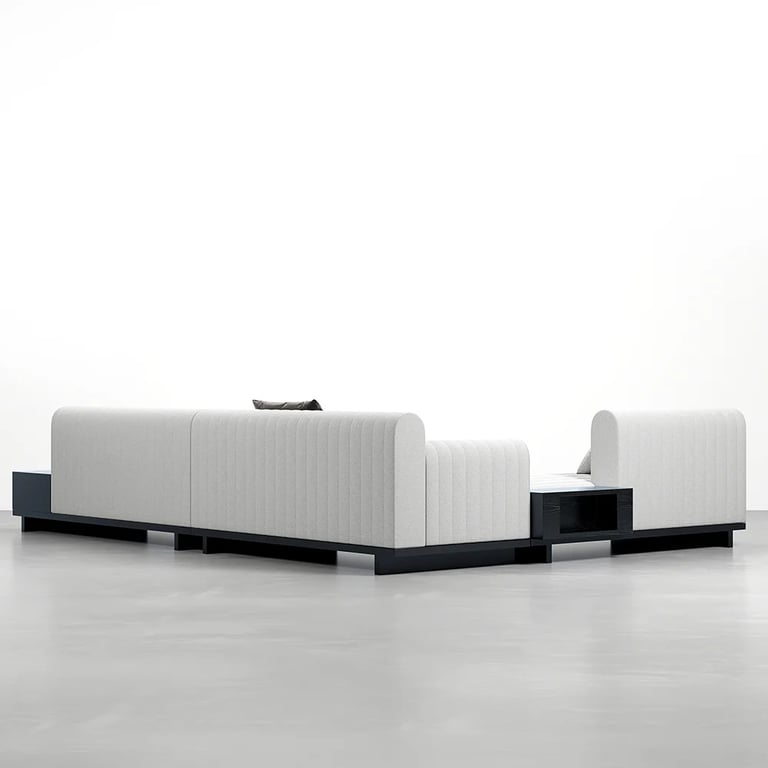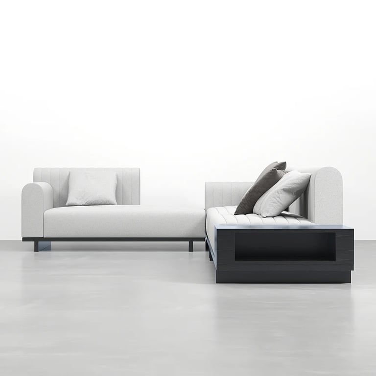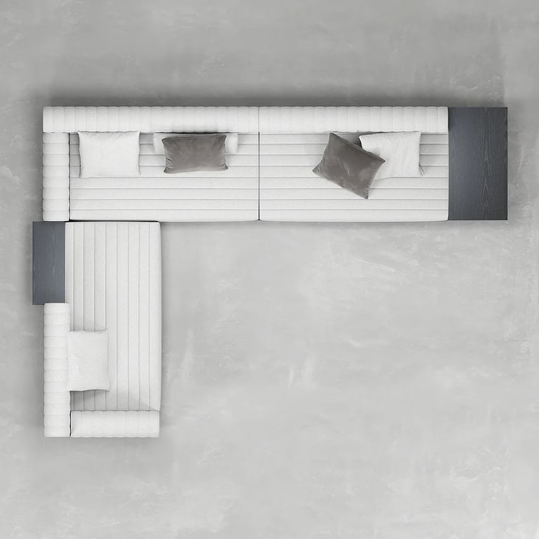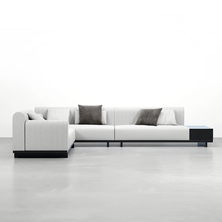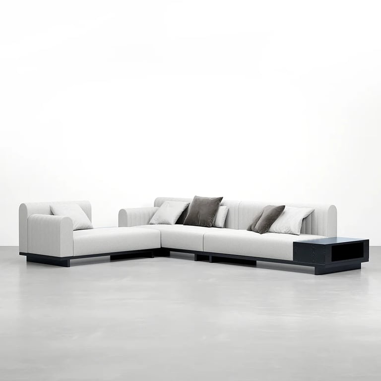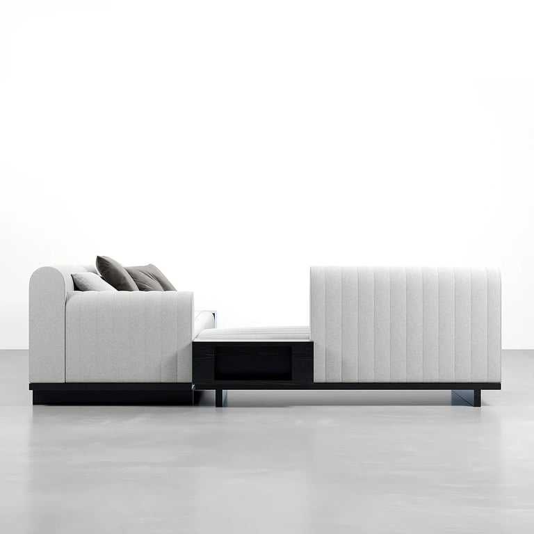 وحدة تلفزيون أنيقة تجمع بين الخطوط الهادئة والوظيفة العملية، مصنوعة من الخشب الطبيعي بواجهات مضلّعة متحركة وقاعدة بأرجل كروية تضيف لمسة تصميم مميزة لغرفة المعيشة.