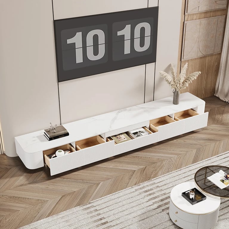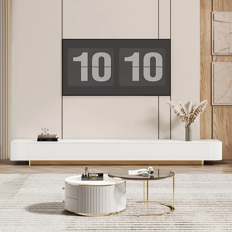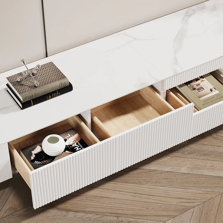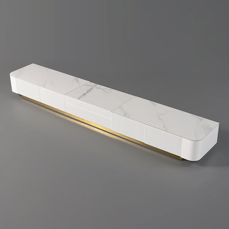 وحدة تلفزيون مصنوعه من الخشب الطبيعي الفاخر بسطح رخامي أبيض و واجهة أمامية بتصميم عصري. قاعدة ذهبية تضيف لمسة فخامة، و أدراج واسعة لتخزين كل احتياجاتك. مثالية لغرفة المعيشة الحديثة.