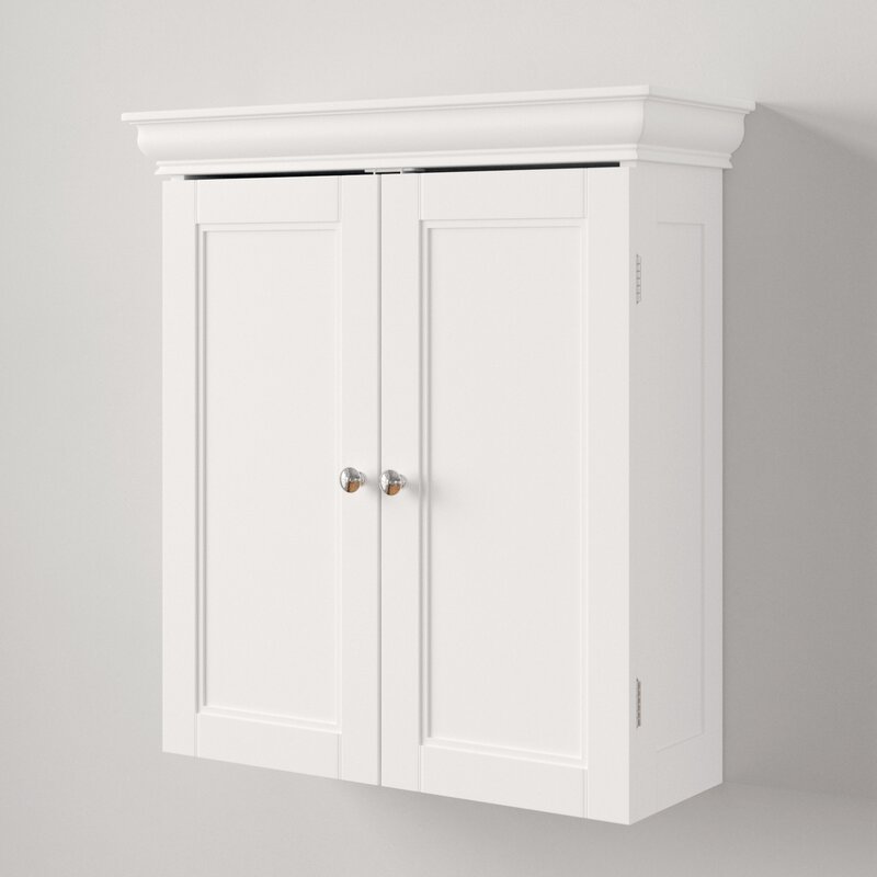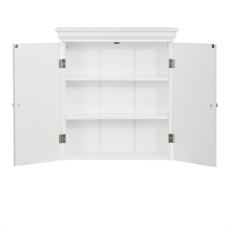 خزانة حمام جداريّة حديثة مصنوعة من الخشب الطبيعي بتشطيب أبيض أنيق، مصممة بأبواب مزودة بإغلاق مغناطيسي ومقابض مطلية بالكروم لتجمع بين الأناقة والعملية.