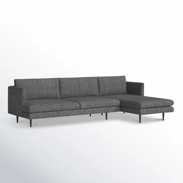 ُبرز الخطوط النظيفة لهذه الكنبة الركنية بذراعيها المستقيمتين المتدرجتين وأرجلها الأسطوانية الخشبية.