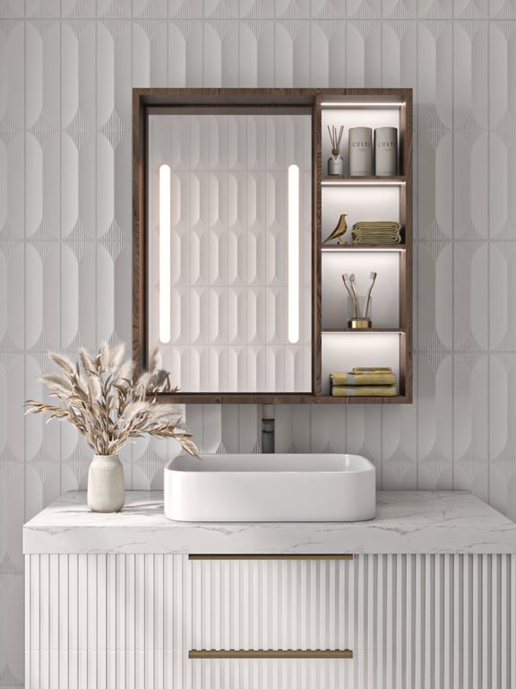 A modern smart mirror cabinet with LED lighting and multiple storage shelves — crafted from natural wood resistant to moisture, combining practicality, elegance, and space-saving design.