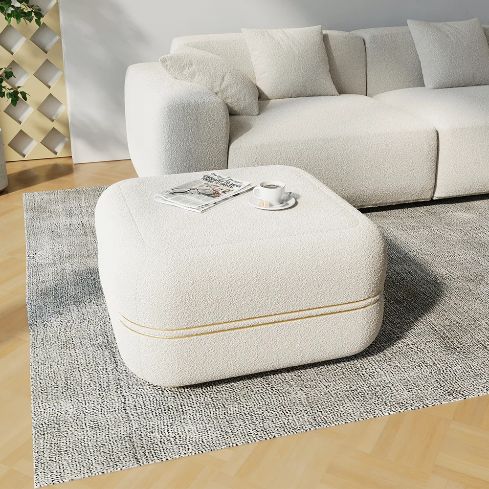 A luxurious ottoman featuring a soft bouclé texture and solid natural wood structure for comfort and durability.