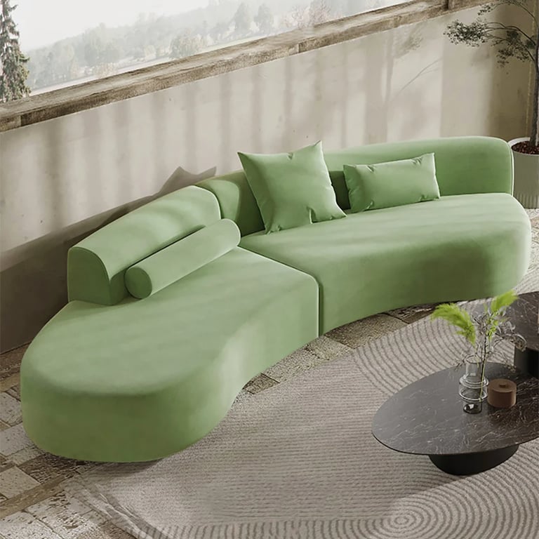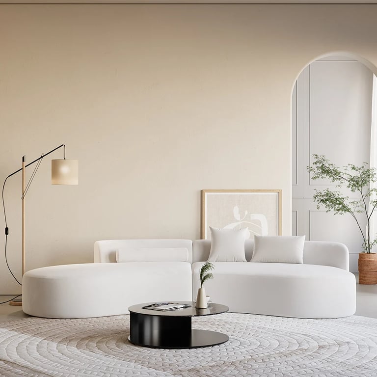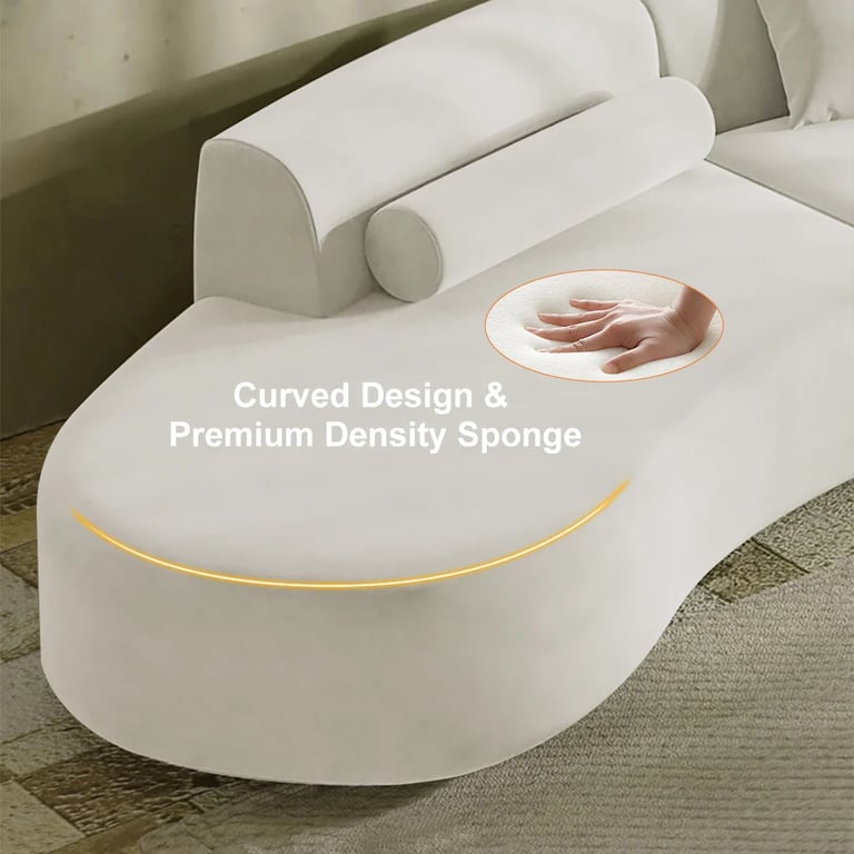 The Elora Velvet Wave Sectional captures modern elegance with its fluid, curved form and soft white velvet finish. Designed in two pieces for easy arrangement, this 4-seater chaise sectional offers generous space and sculptural beauty. Includes three matching pillows for added comfort and sophistication — a statement piece perfect for stylish living rooms.