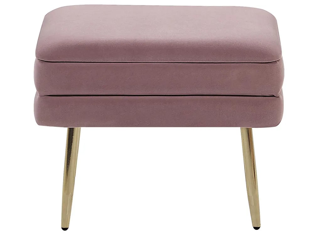 A chic ottoman upholstered in soft, elegant fabric, featuring a natural wood structure and elegant golden metal legs. Designed with a lift-up seat for hidden storage and long-lasting comfort.