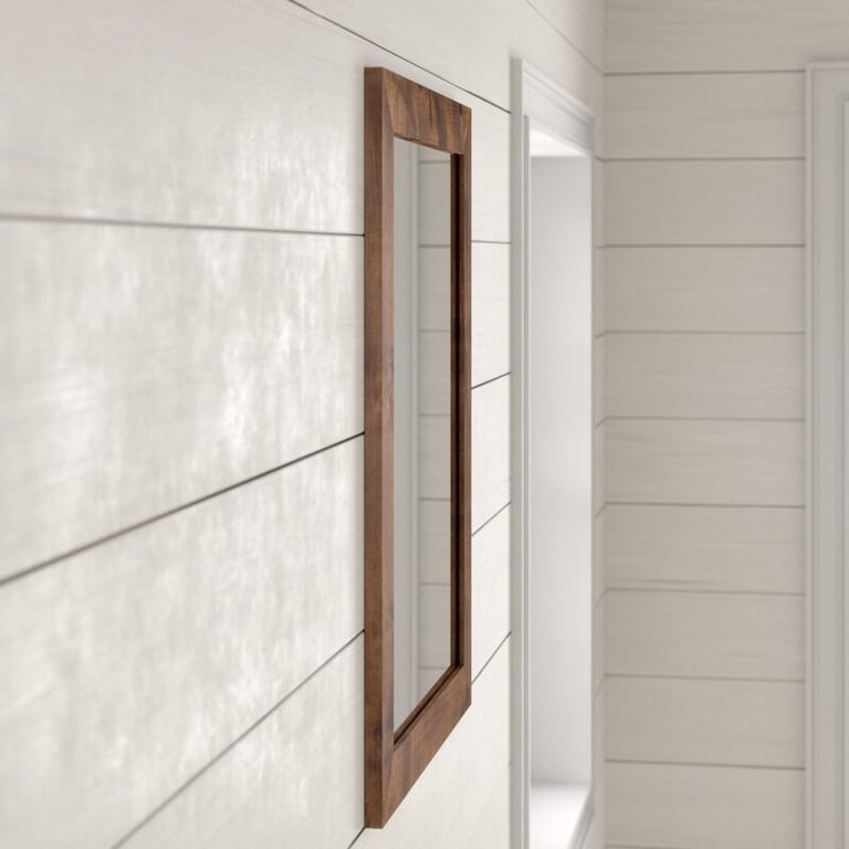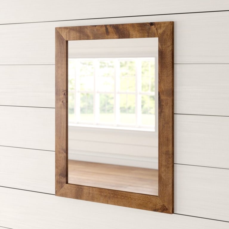 A farmhouse-inspired vanity mirror crafted from natural wood with a moisture-resistant finish — combining durability, practicality, and rustic charm for modern bathrooms.