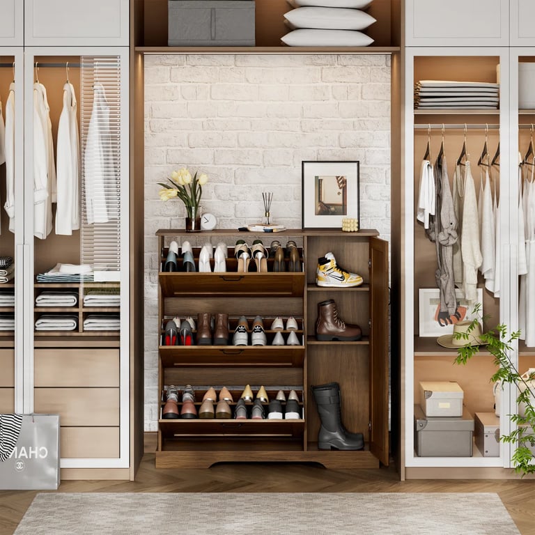 Montreil is a beautifully crafted, large-capacity shoe cabinet designed for families and homes that require maximum storage. Made from durable natural wood, it features three wide flip-down compartments that neatly organize various shoe types. The additional side unit features tall shelves, ideal for storing boots, making the cabinet highly versatile and practical. With its classic-modern finish, metal handles, and sturdy base, Montreil blends functionality with elevated style, making it a standout centerpiece for any entryway.