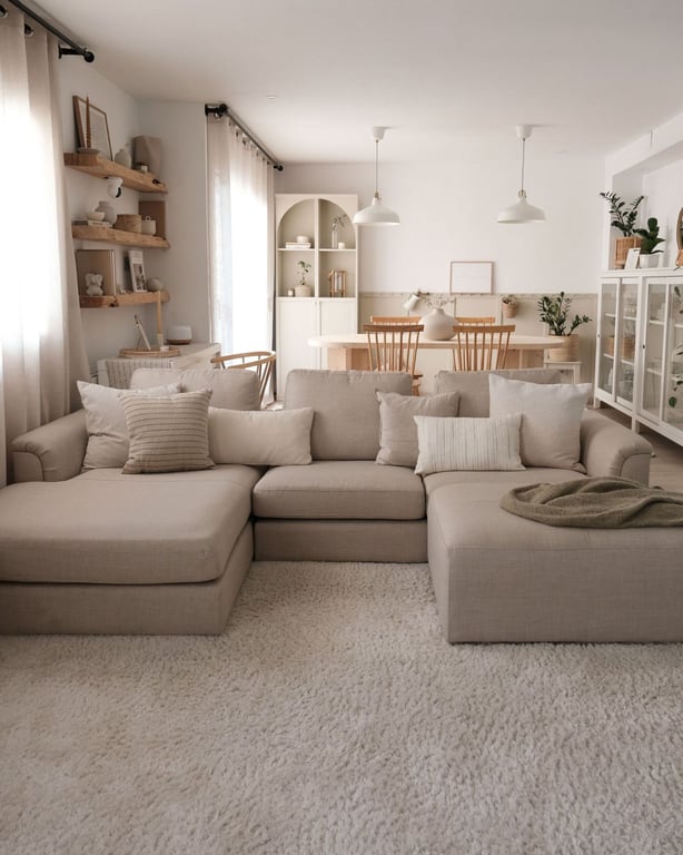 A modern L-shaped corner sofa with an ottoman, crafted for comfort, elegance, and everyday ease—featuring linen upholstery, sturdy stainless steel legs, and removable cushion covers.