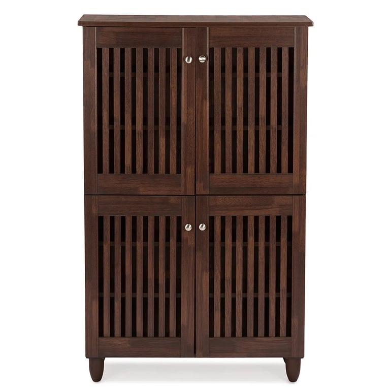 A natural wood shoe cabinet with slatted doors, designed to provide elegant storage and proper ventilation for shoes.