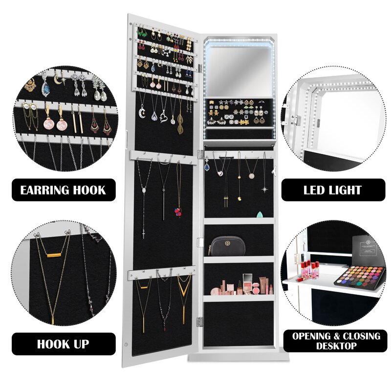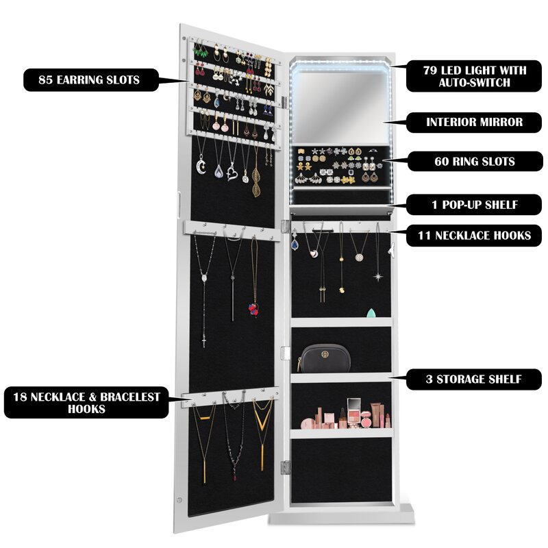 This wide armoire quickly gets all your jewellery properly organised and preserved in good condition, with 85 earring slots, 29 necklace and bracelet hooks, 60 ring slots, 1 pop-up shelf, and 3 drawers.