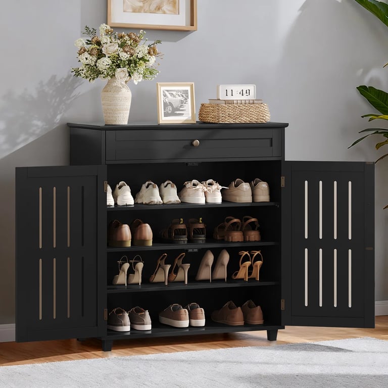A modern shoe cabinet crafted from natural wood, featuring a clean ventilated design and a practical top drawer for extra storage.