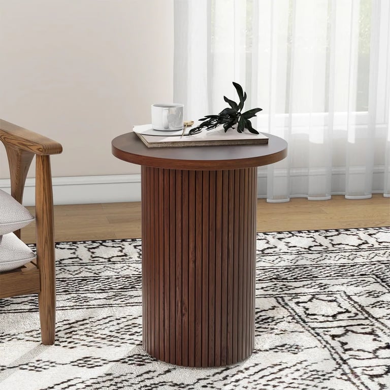 Make a statement with this wood round end table in your living room. The unique vintaged round solid wood side table top is accented by a linear pedestal-like texture. The look of the classic wood grain, but the entire piece is skillfully crafted from sturdy solid wood materials in a refined and eclectic manner. The top of the table cannot be removed, which is practically integrated into the table.