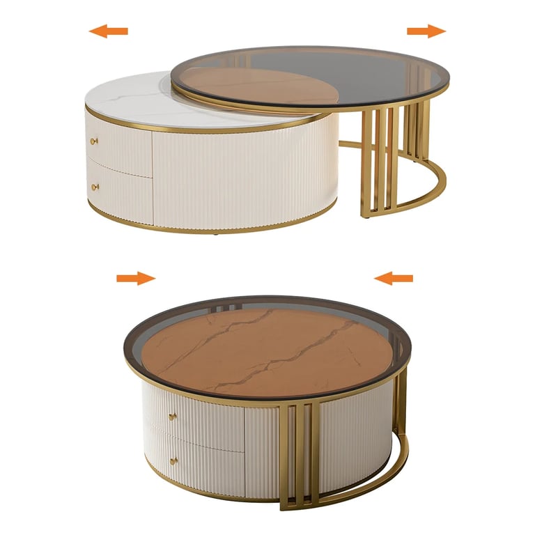 A sophisticated coffee table with glass and marble dual tops, golden details, and hidden storage—crafted from durable natural wood.