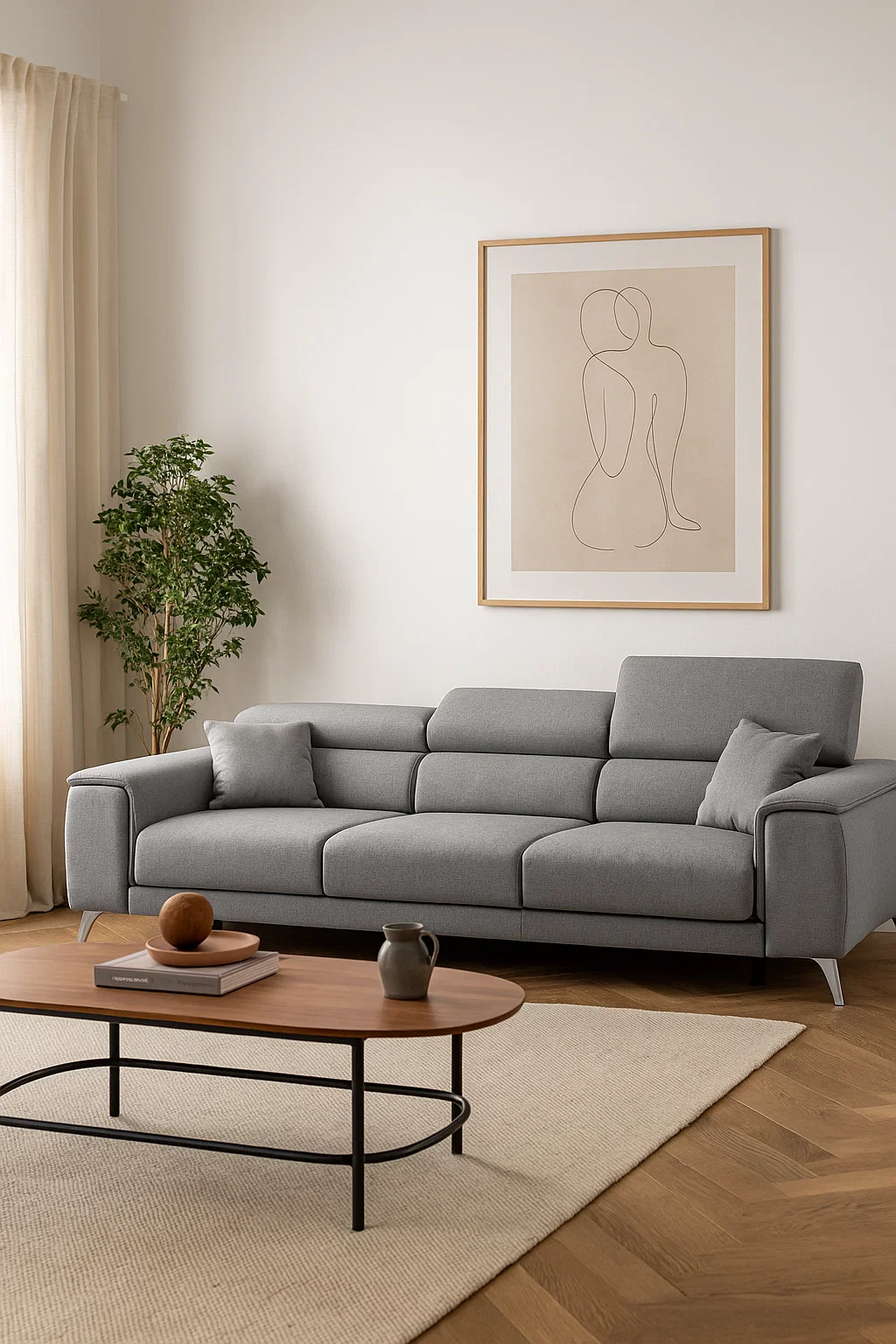 This three-seater sofa, crafted from natural wood, combines a modern design with gentle, flowing curves. Its soft, neutral-toned upholstery adds a sophisticated and comfortable touch to any living space.