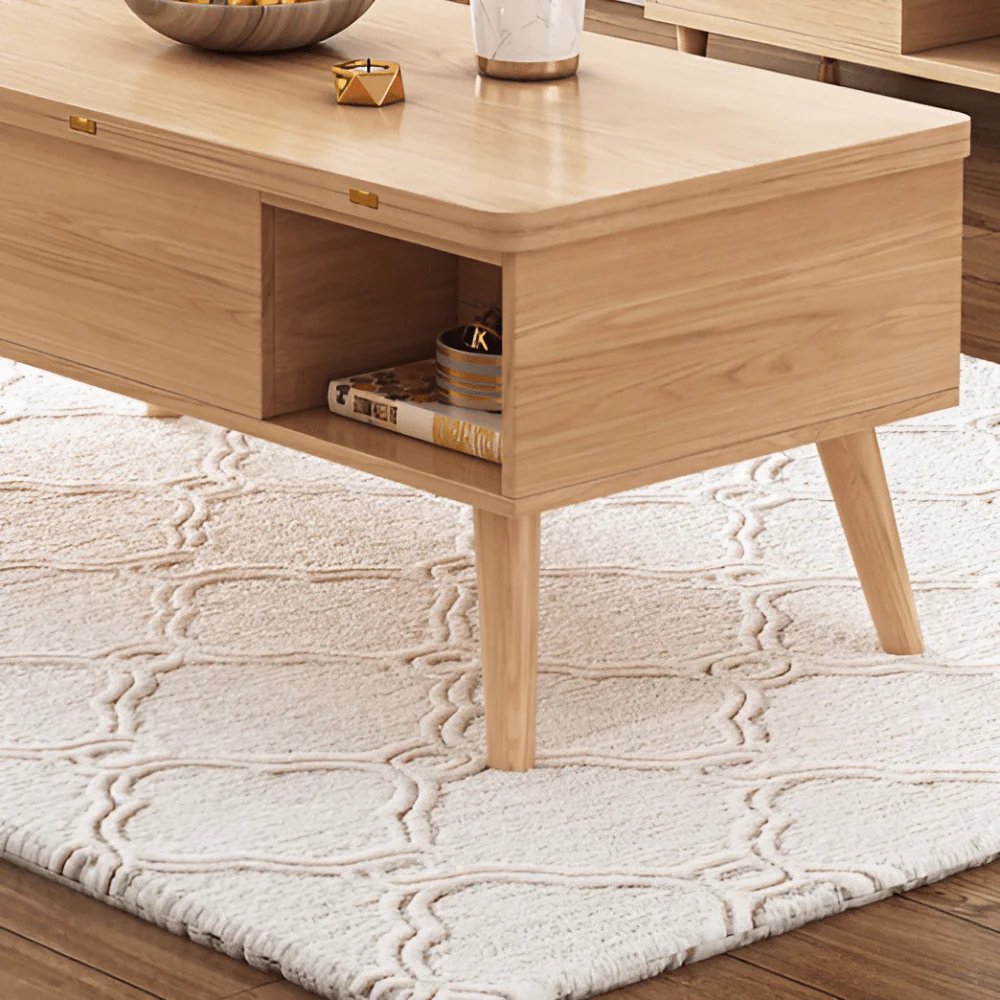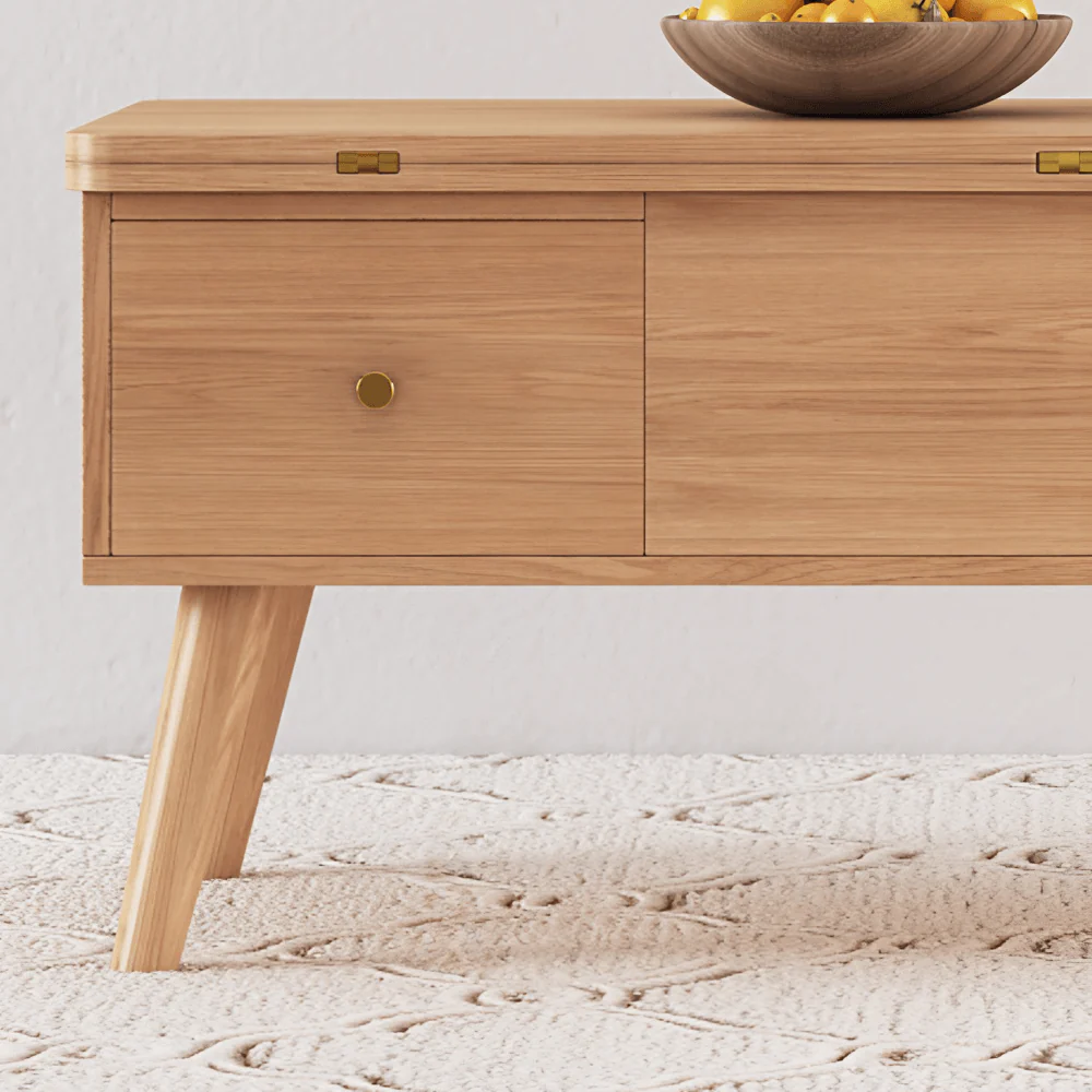 A stylish multi-functional coffee table made of natural wood, featuring a lift-top surface and hidden drawers—practical for both storage and work.