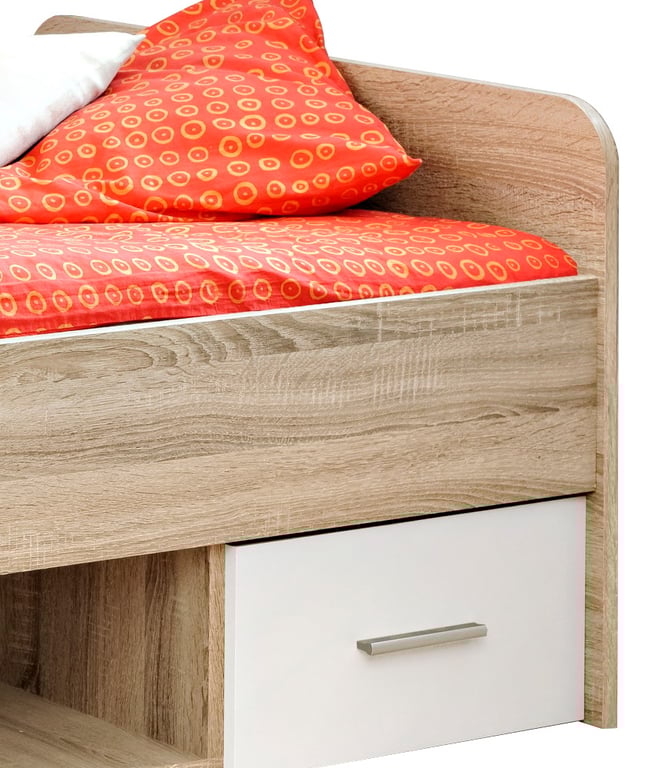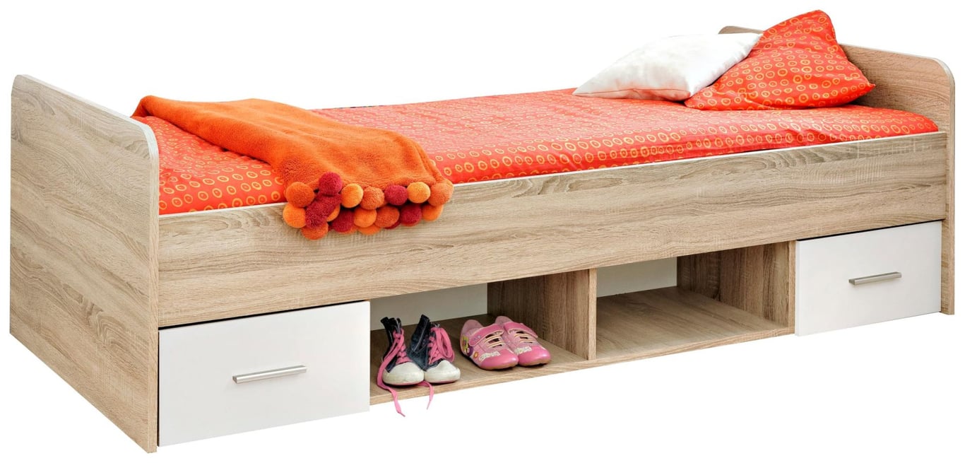 Enjoy organization and style with the “Vera” bed, crafted from natural wood and featuring two drawers plus open shelves underneath—perfect for shoes, books, or accessories, with a modern design for any space.