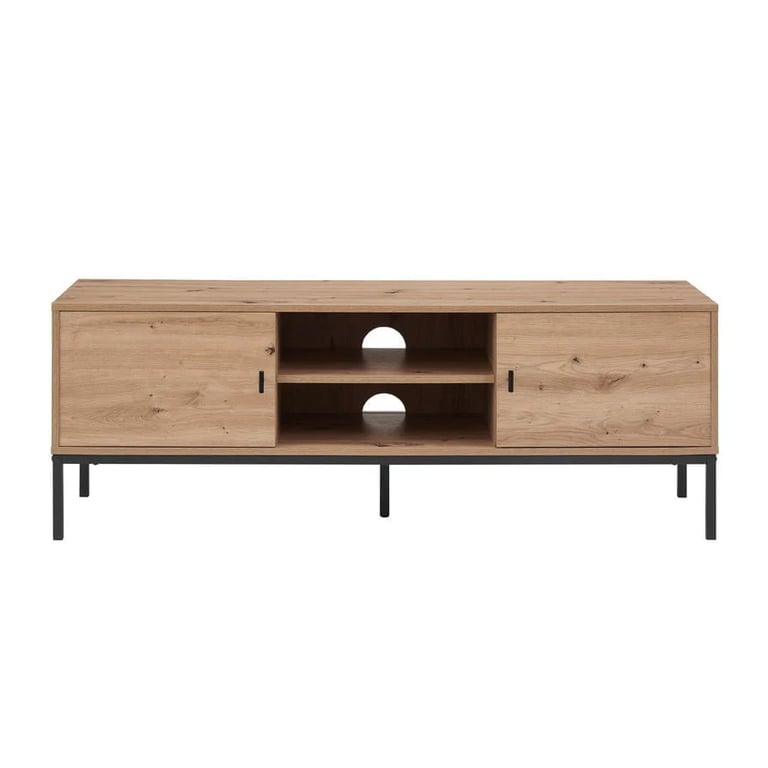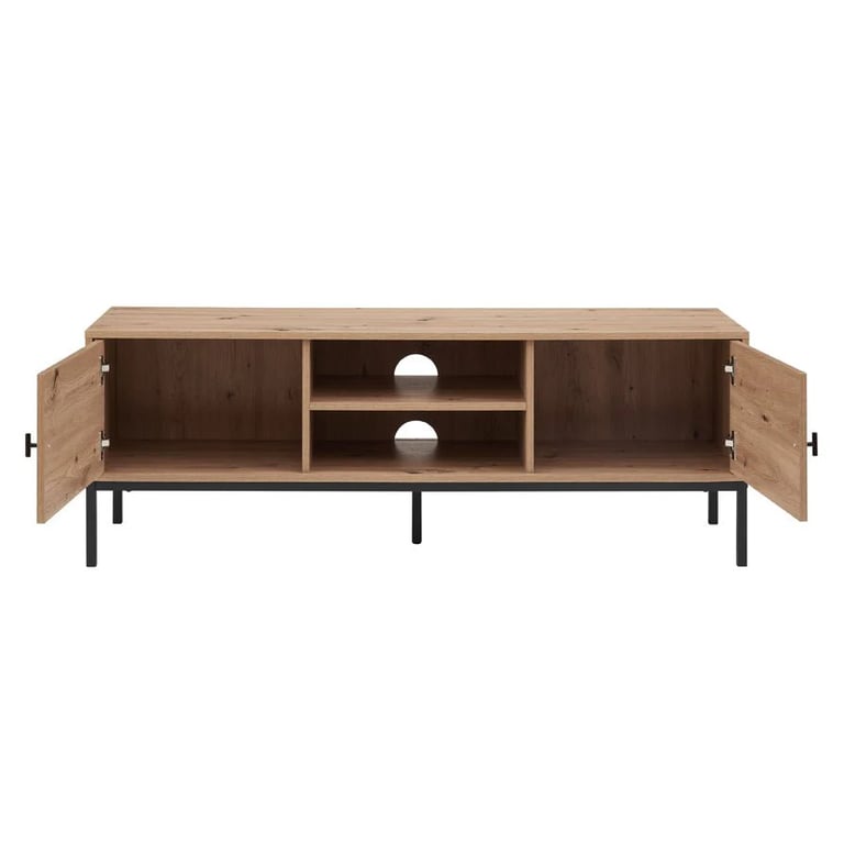 Elevate your living room with the “Vero” TV stand, made from premium natural wood with a smooth, long-lasting finish. Two side cabinets keep clutter out of sight, while the open center shelves provide easy access to media devices and décor. The slim metal base adds stability and a clean contemporary look, and the raised height makes floor cleaning effortless. Built to withstand daily use with materials treated for moisture and insect resistance.
