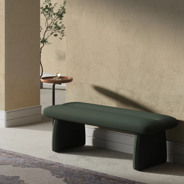 The soft upholstered seat provides comfortable seating, making it ideal for entryways, bedrooms, or living areas. Its streamlined silhouette and smooth edges add a refined touch that complements various décor styles.